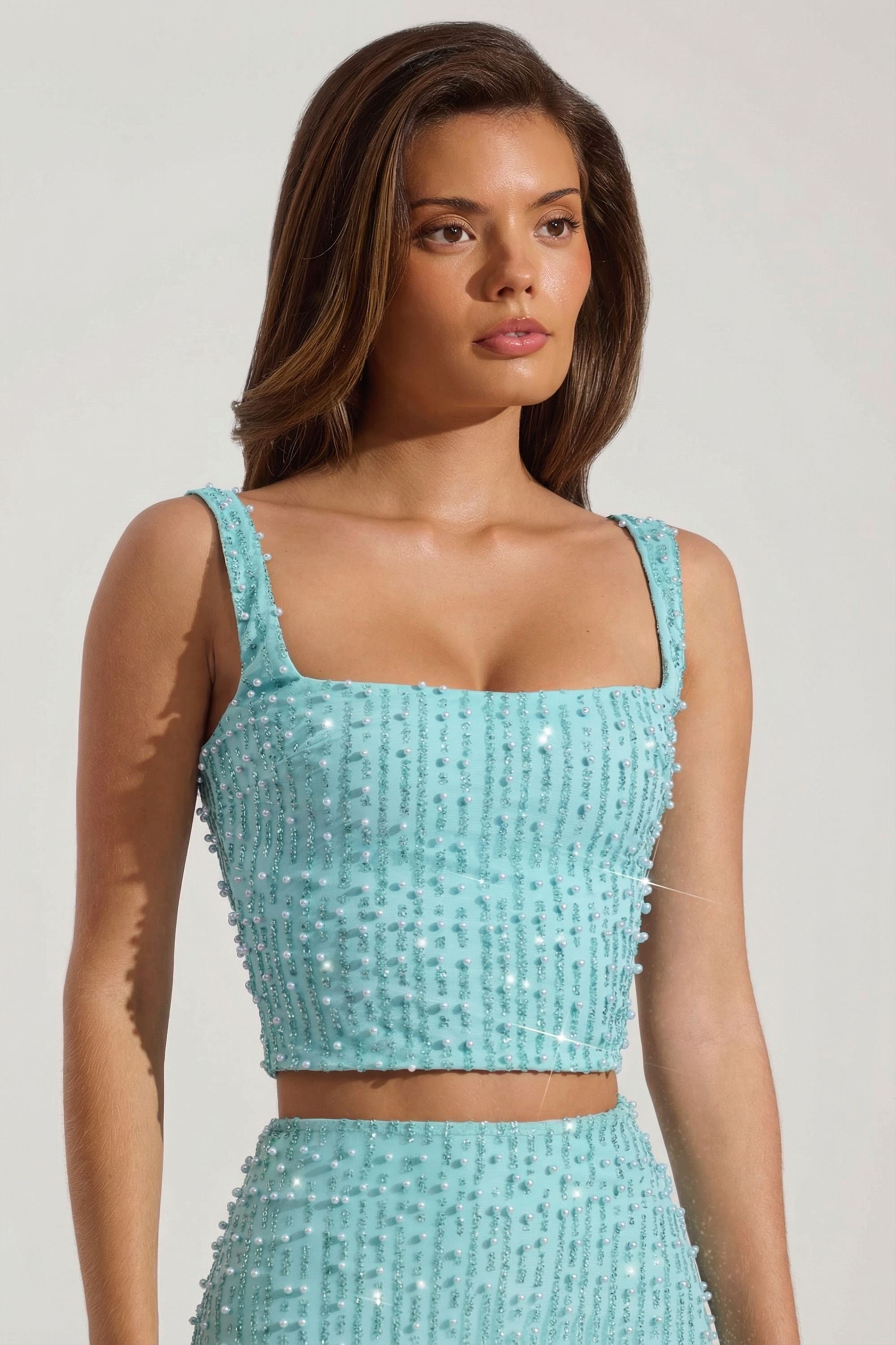 Embellished Square-Neck Crop Top in Aqua Blue