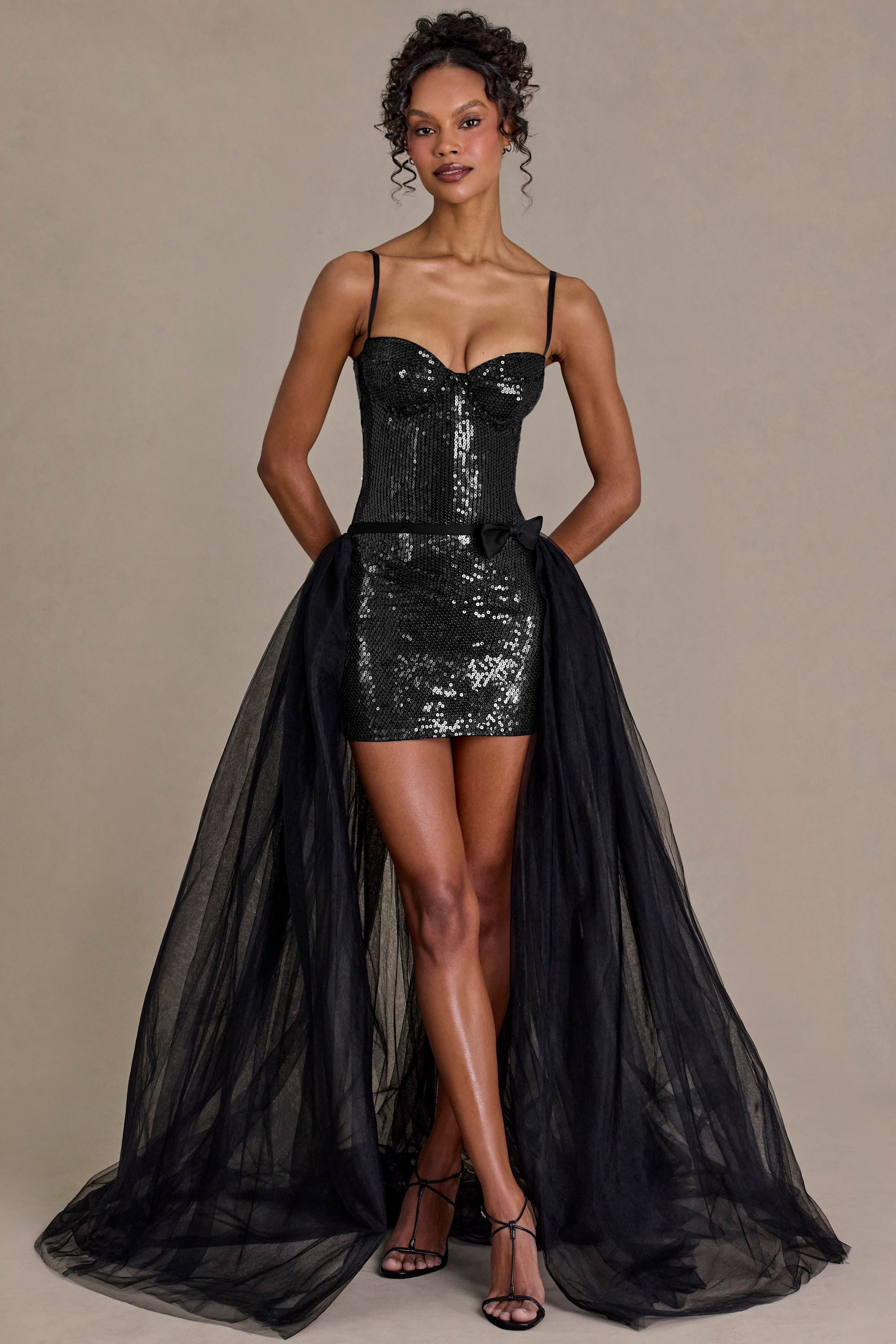 A statement piece designed for maximum impact. Crafted from structural. elegant tulle. this show-stopping black bustle skirt features a dramatic. voluminous silhouette and is finished with a sleek satin waistband and a delicate. non-functional bow at the left side. Intended to be paired with the Theodora mini dress. the design is fully lined for a refined finish and elevated with premium fabrication throughout.